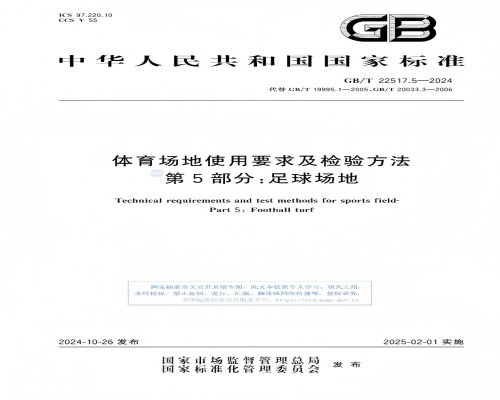 最新发布的国家标准GB/T 22517.5-2024《体育场地使用要求及检验方法 第5部分:足球场地》已于2025年2月1日正式实施。