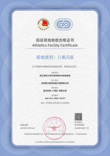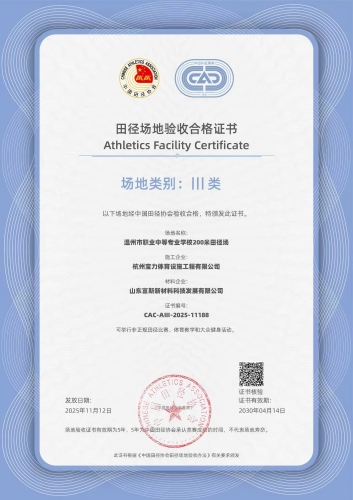 2025年11月,由杭州宝力体育设施工程有限公司承建的温州市职业中等专业学校400米田径场项目正式通过中国田径协会验收,荣获“II类B级田径场地合格证书”。