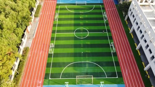 学校五人制足球场标准尺寸为长方形,国际比赛长度38-42米、宽度20-25米,学校常用40米×20米(面积800㎡)。球门宽3米、高2米,线宽8厘米。场地需平整防滑,配备良好排水系统,比赛用4号低弹球,分上下半场各20分钟,替换不限次数,无越位规则。