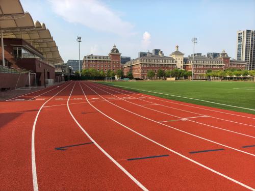 2024年由杭州宝力体育设施工程有限公司承建的温州医科大学洞头校区项目,含标准塑胶跑道、多彩看台及篮球场等,周边红砖建筑与绿化带相映,营造活力健康的校园氛围,满足多样化体育需求。