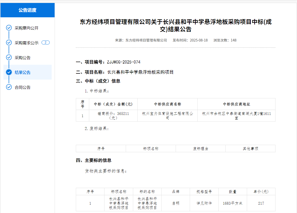 二、项目名称:长兴县和平中学悬浮地板采购项目