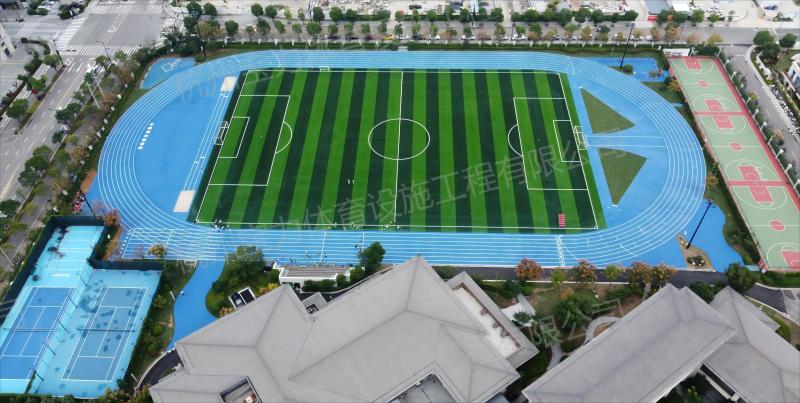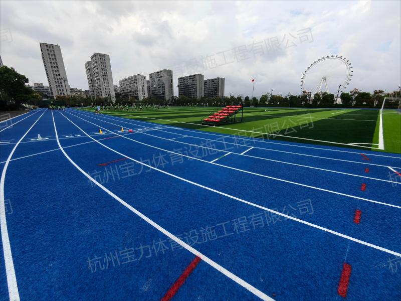 2024年由杭州宝力体育设施工程有限公司承建的舟山绿城南海实验学校400米透气型跑道项目,采用国际标准蓝色跑道搭配白色分道线;内设绿色人工草坪足球场,标线精准。周边配建红绿篮球场、标准化网球场及生态绿化带。通过GB 36246-2018检测,打造安全、生态的现代化运动场域。